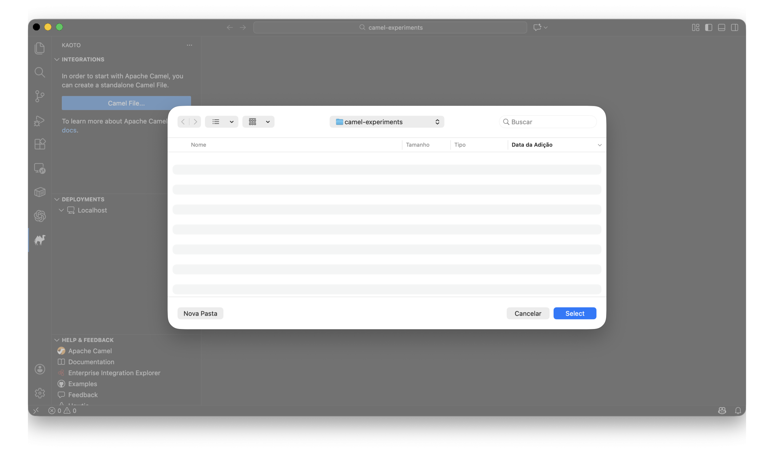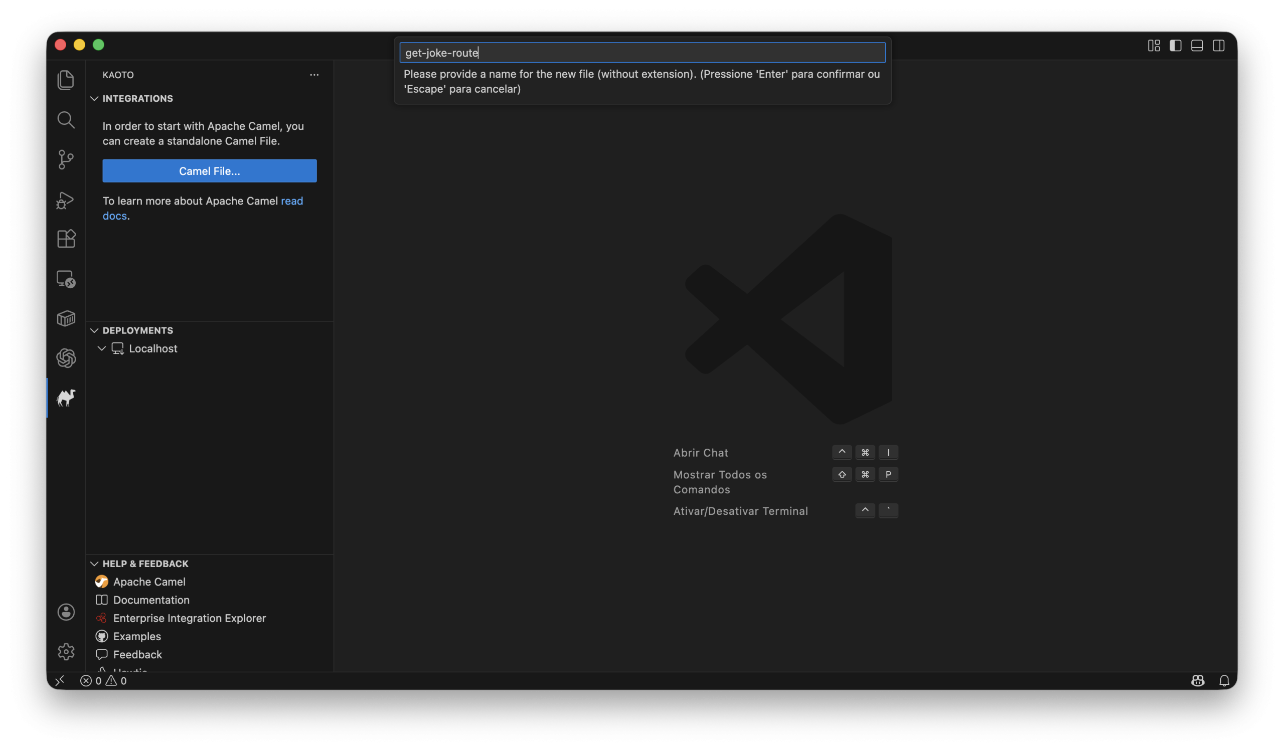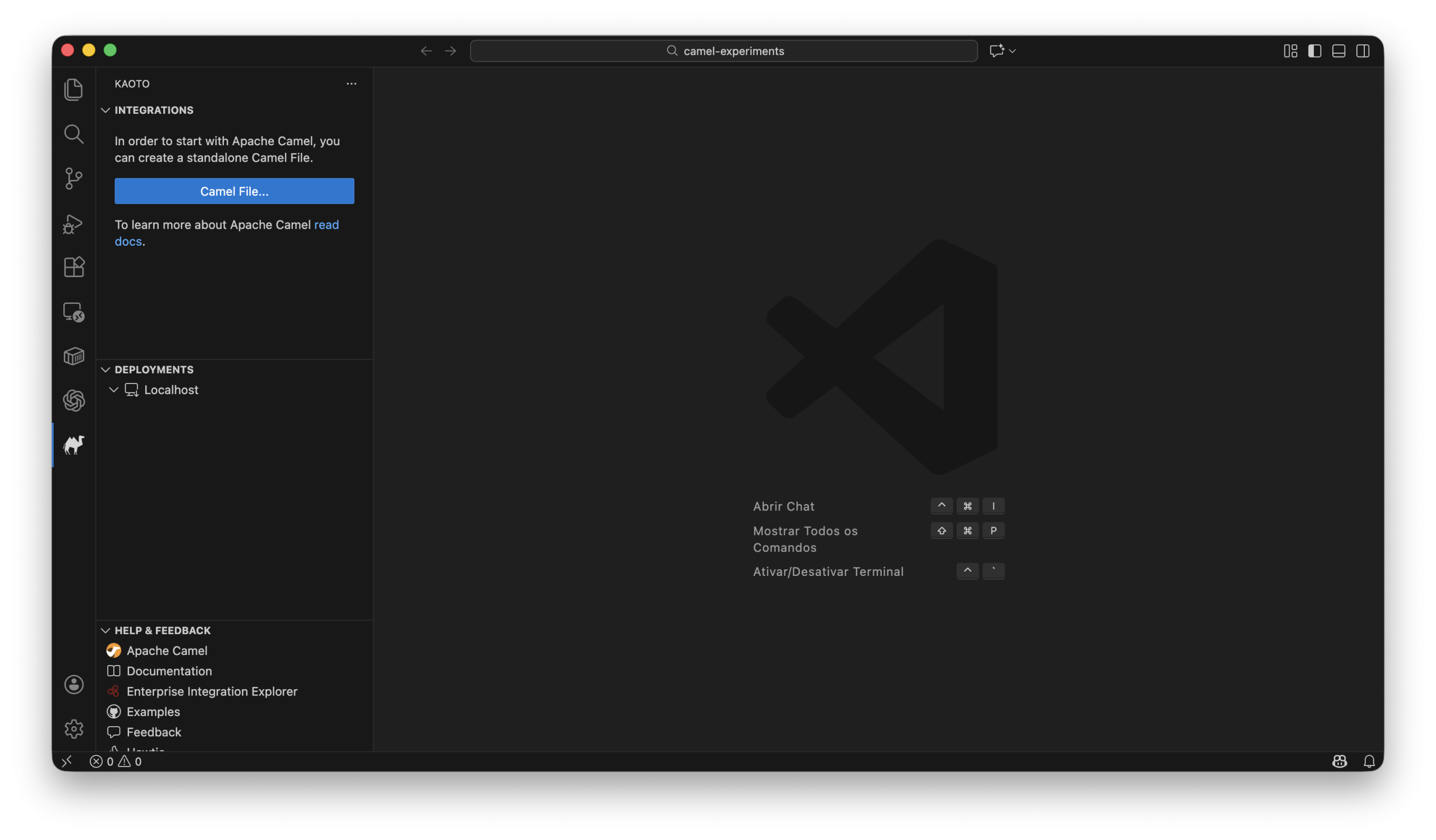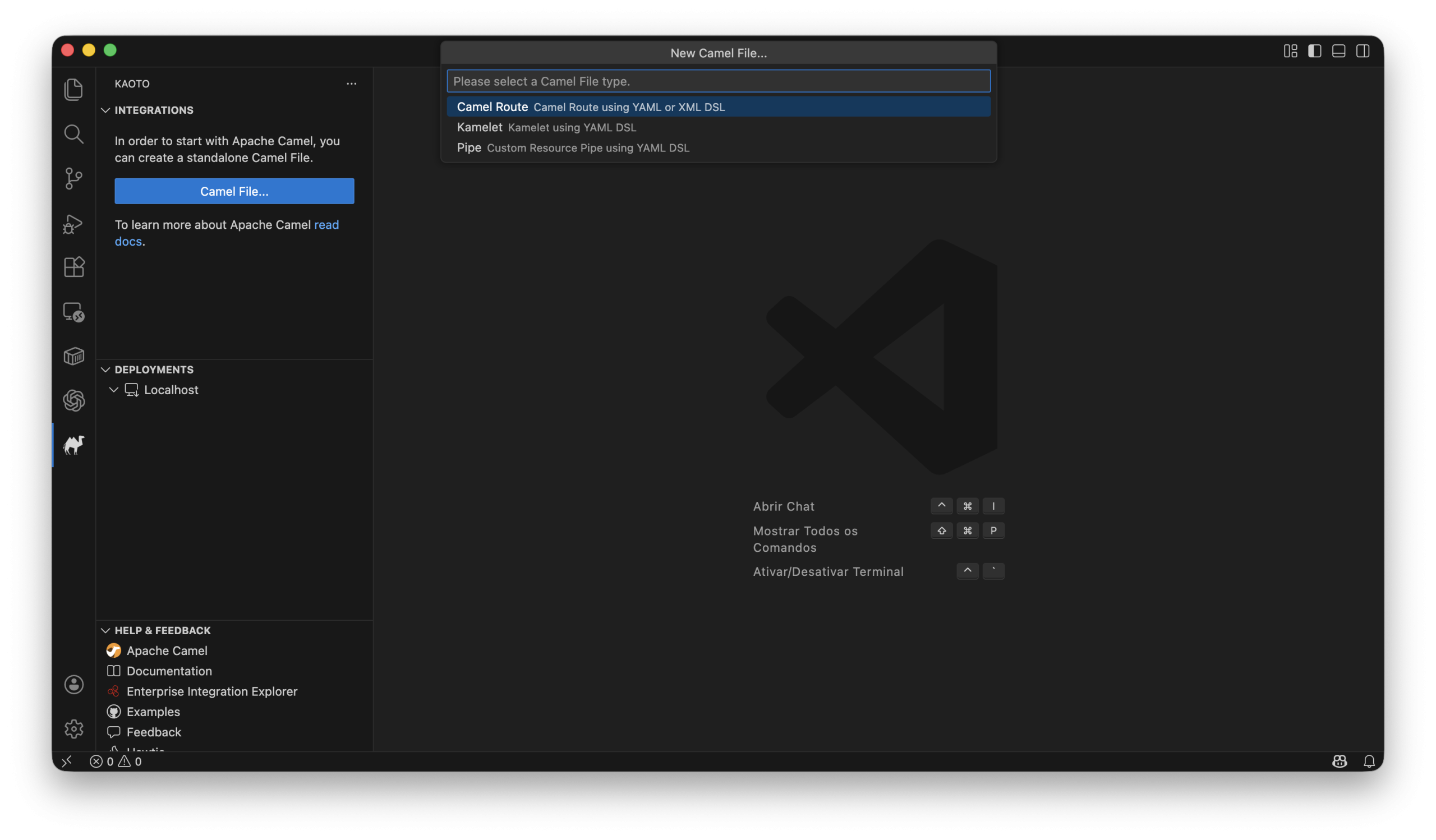 O Kaoto é uma extensão do VS Code que utiliza o Camel CLI via JBang para rodar e empacotar integrações localmente.